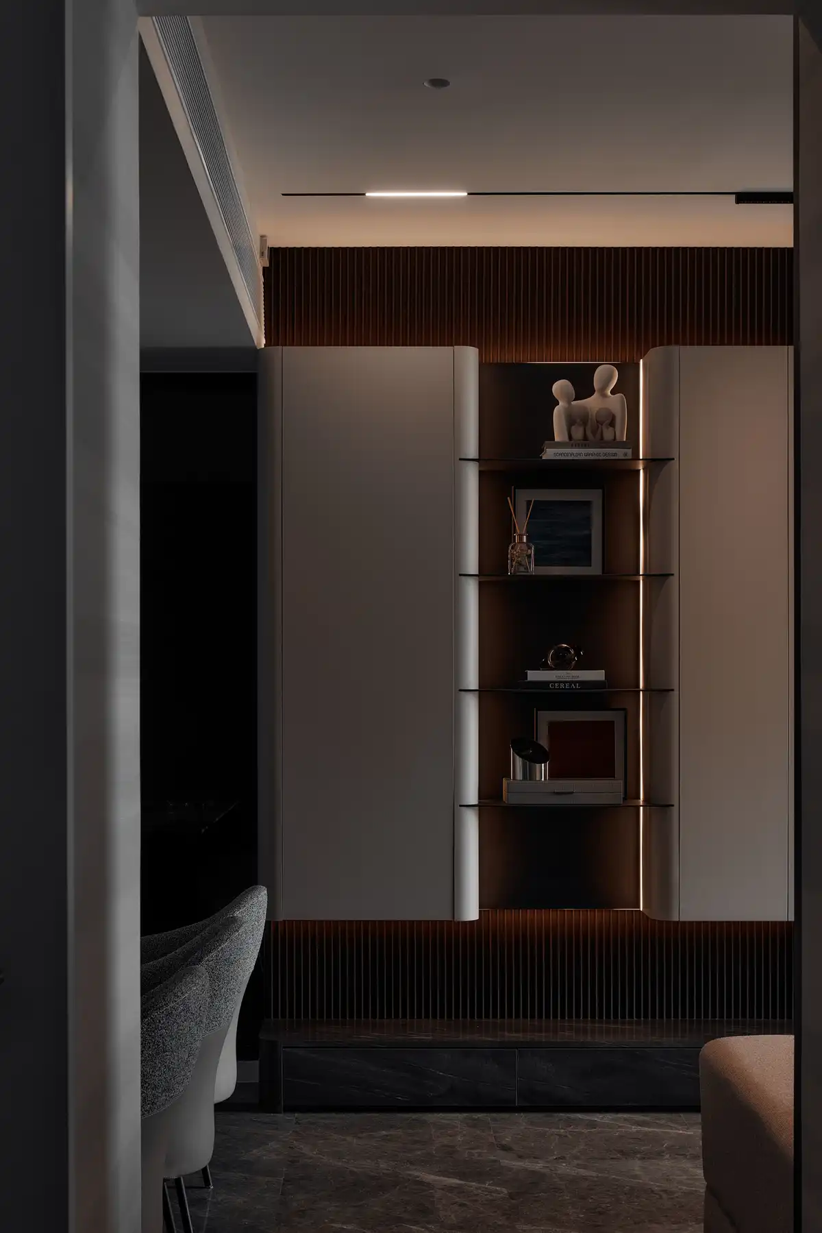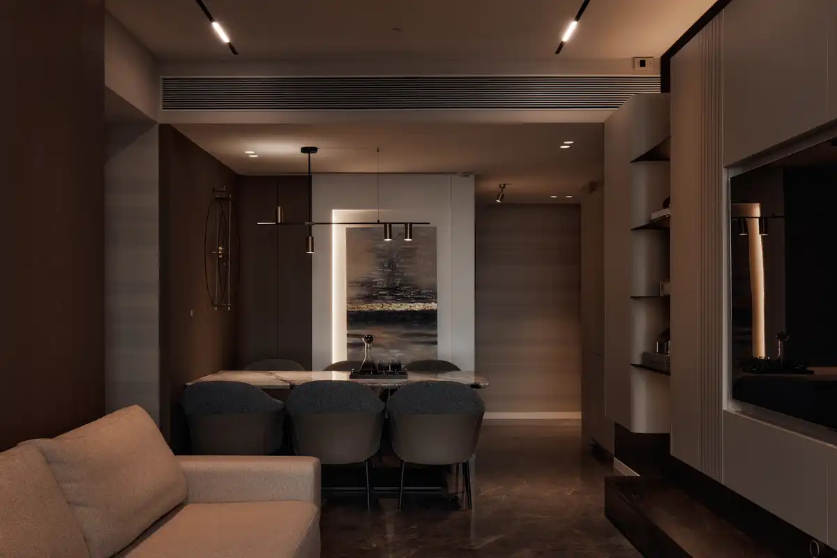 Collaboration with the client was pivotal to the project’s success. Regular design consultations were held to align vision and execution, where preferences, lifestyle needs, and aesthetic desires were discussed in depth. This collaborative approach was enriched with visual aids like mood boards, 2D drawings, and 3D renderings, allowing the client to visualize how specific elements, such as the unique grooves and lighting schemes, would integrate into their living space. Adjustments were made based on feedback, ensuring that the final design not only aligned with the client’s vision but also adapted to their evolving needs.