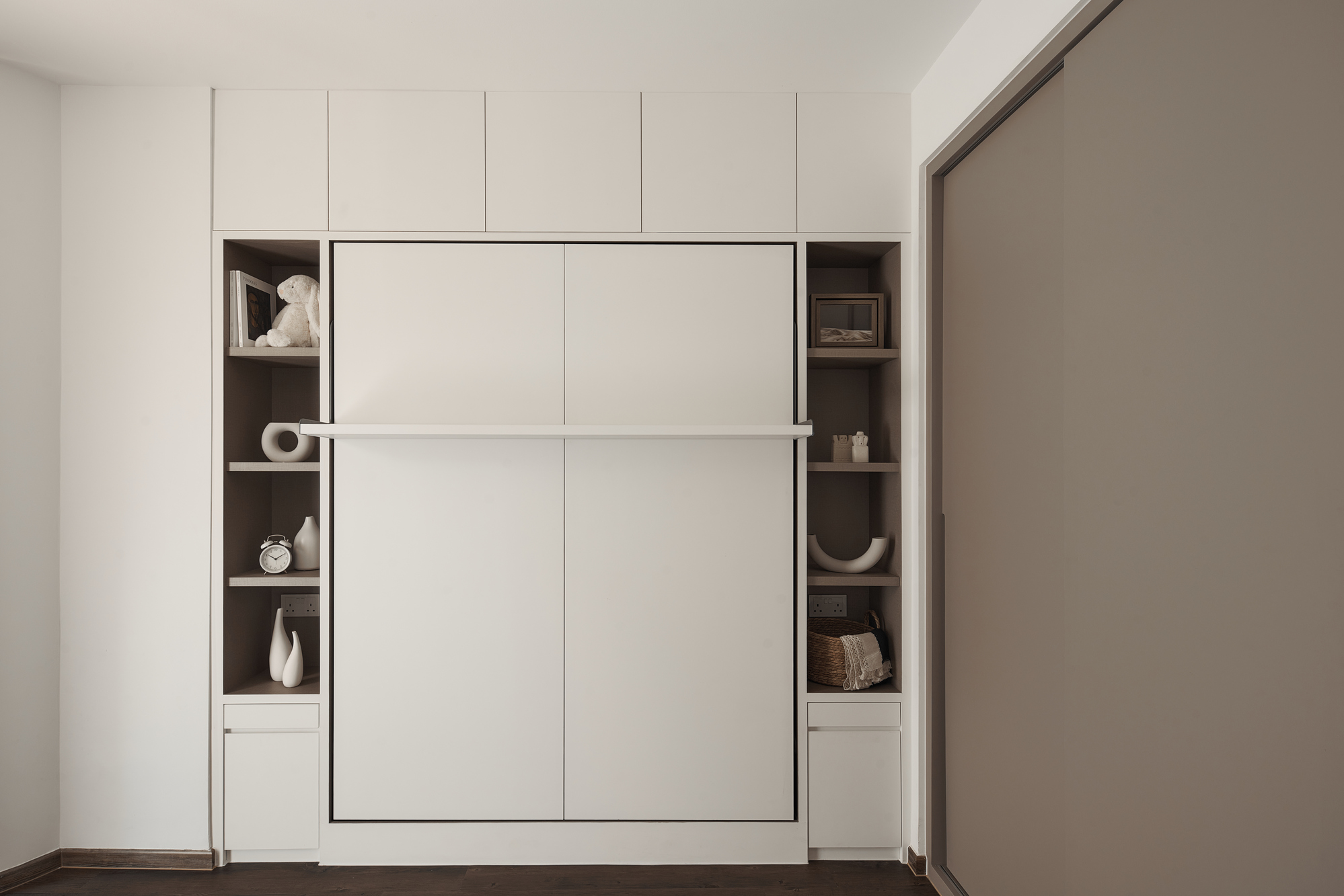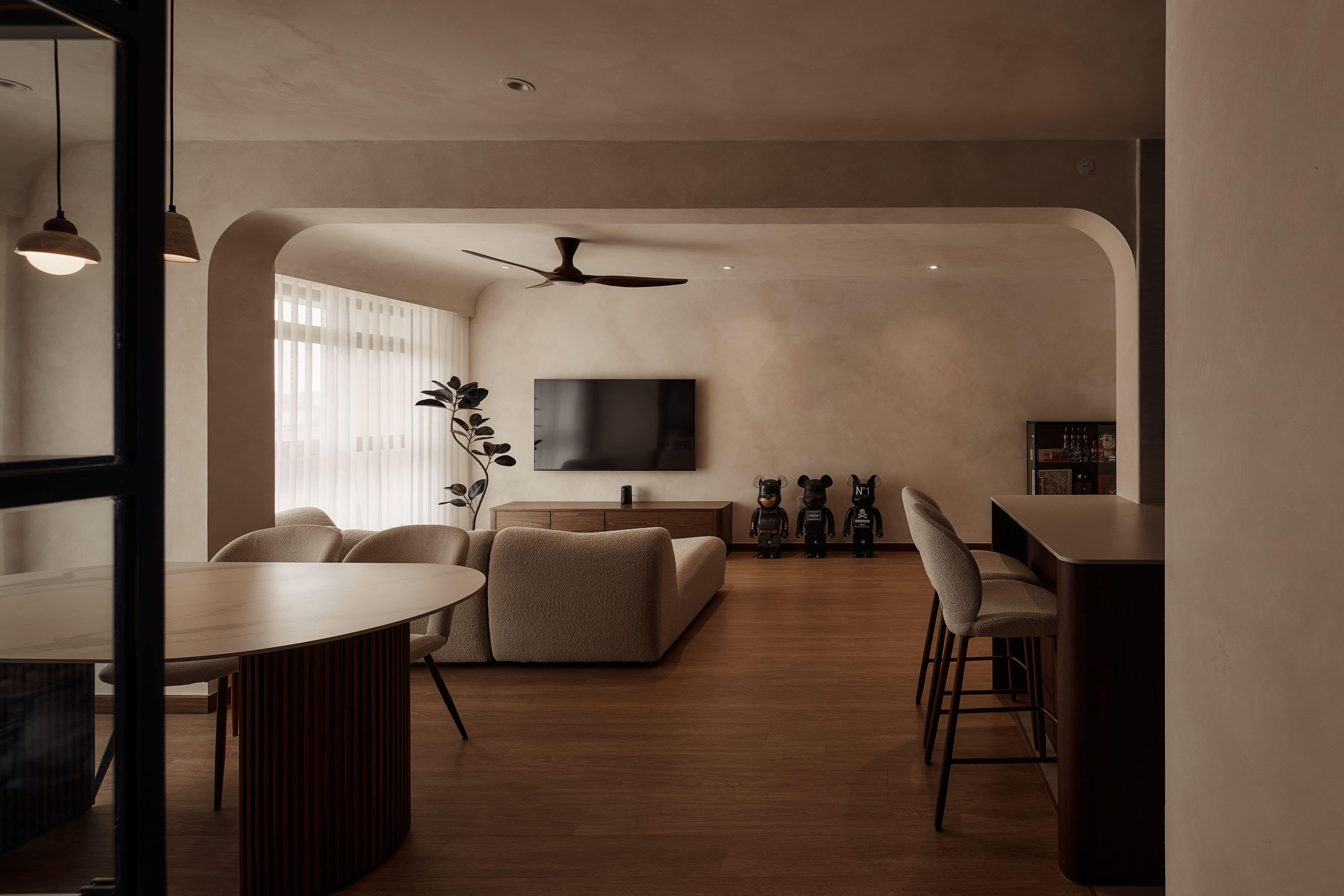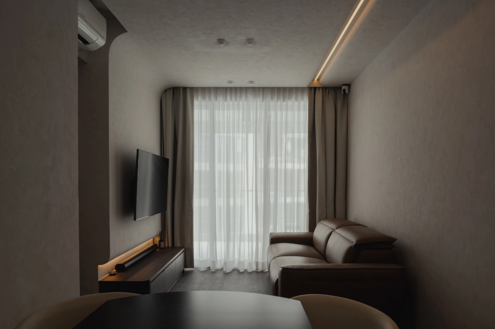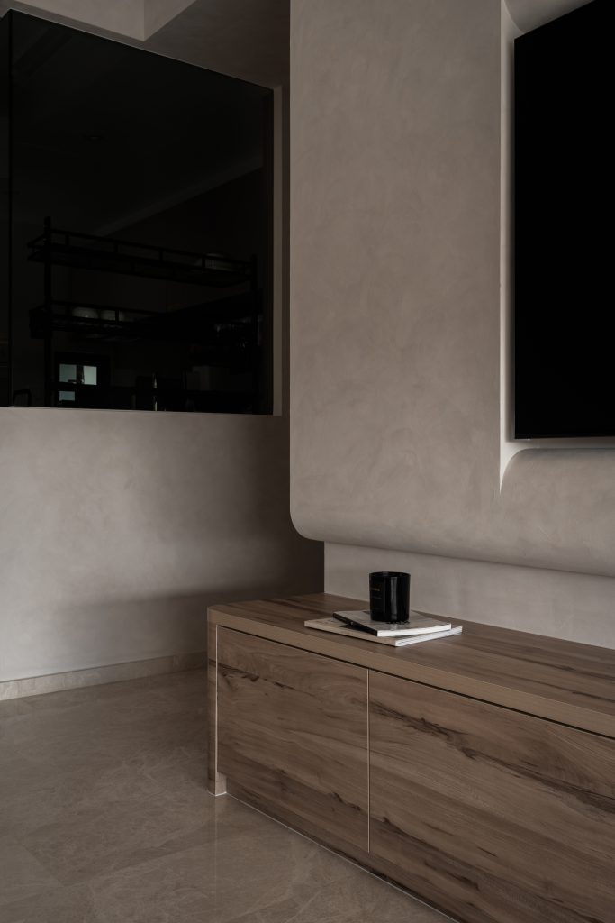 Wabi-sabi’s functional minimalism is perfect for small spaces like Singapore’s BTO flats and condos. This style focuses on multipurpose furniture that combines aesthetics with functionality. A sturdy table can serve as both a dining and work-from-home desk, while a platform bed with built-in storage maximizes space in compact bedrooms. Soft, earthy tones and textured elements like limewash walls and rustic wood shelving add warmth and depth without cluttering the space. A fluted panel hidden door can blend seamlessly into the design, maintaining an open feel. The result is a functional yet stylish space that feels both purposeful and inviting.